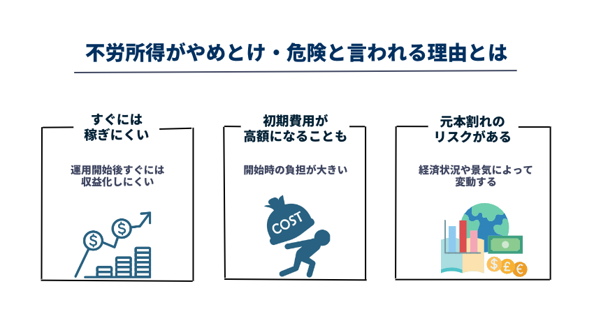 不労所得がやめとけと言われる理由は、すぐには稼げないこと初期費用が高くかかってしまうことがあり失敗した時のリスクが高いためやめとけ、と言われることがあります。